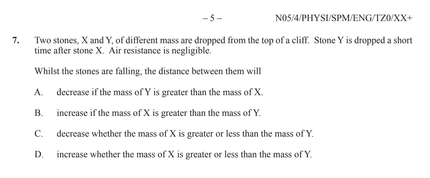 Undrar lite kring denna uppgiften, förstår att det är D. Är detta för att accelerationen funkar typ exponentiellt så för att sten X tappades innan så hinner accelerationen verka mer och sten X har därav högre hastighet?