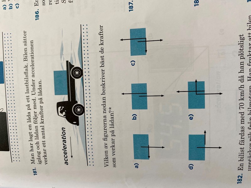 När lastbilen accelerar åt vänster trycks lådan bakåt(höger) .friktionskraften motverkar detta med en kraft åt vänster.
