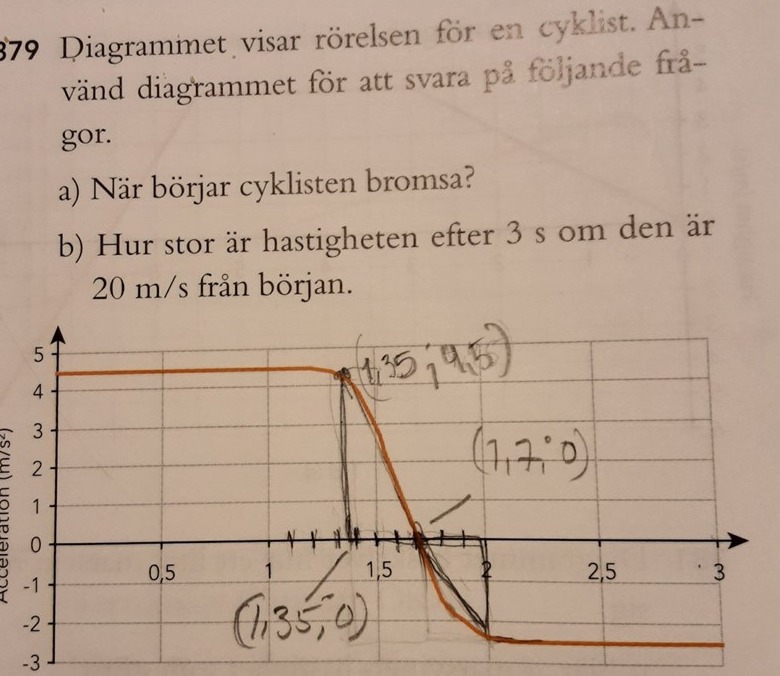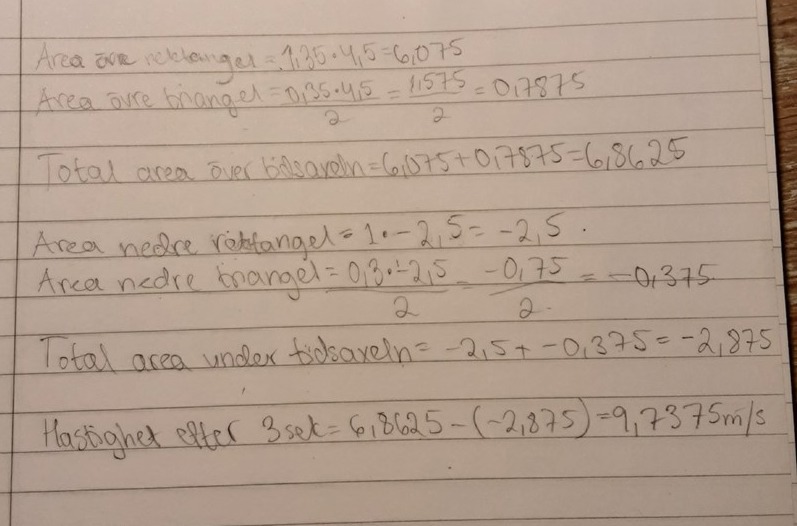 Jag tänker att om man räknar ut arean under grafen när linjen är över tidsaxeln och sedan arean över grafen och subtraherat med linjen under tidsaxeln så får man fram svaret. Jag ritade ut två trianglar för att få med ytan där linjen böjer sig. När jag räknar ut får jag 9,7375 m/s vilket är fel svar. Vad har jag gjort fel?