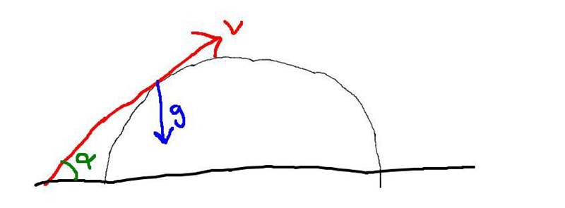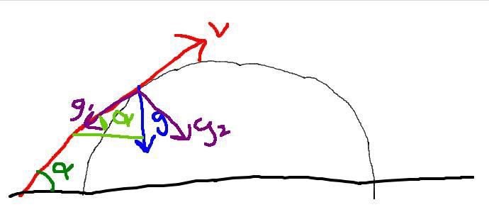 Hur stor är accelerationens komposant längs tangenten till kastparabeln i en punkt på dess uppstigande del? Hastigheten bilder vinkeln a med horisontalplanet.
