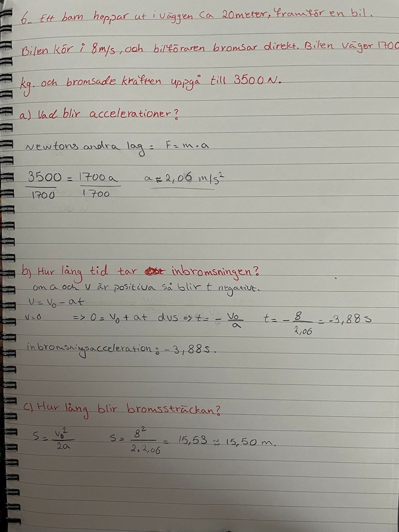 • Om du definierar bilens körriktning som positiv så är v0 = 8 m/s eftersom bilen då rör sig i positiv riktning och a \approx -2,06 m/s2 eftersom den bromsade kraften då är -3 500 N.