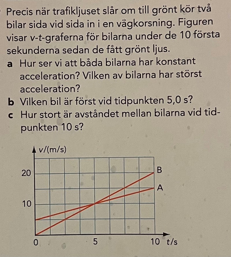 Ja det stämmer och du kan även använda metoden med arean under linjerna för att besvara b-uppgiften. Den frågan gäller vllken bil som har hunnit längst vid tidpunkten t = 5,0 s.
