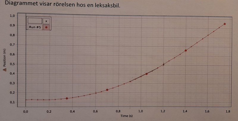 Fråga: Använd diagrammet och bestäm bilens medelacceleration mellan t=0.6 och t=1.2.