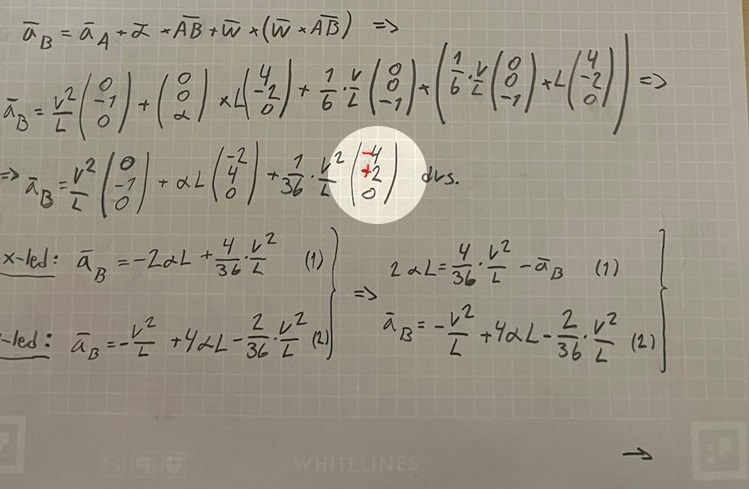 Du har rätt, matrisen ska vara (2 ; -4 ; 0). Tack för hjälpen! Detta ger mig dock ett svar på -7/6 vilket tyvärr fortfarande är fel. Jag misstänker att det är något ytterligare fel längre upp i lösningen som påverkar svaret. Eftersom svaret är positivt så var min första tanke att jag inte ska sätta beloppet av accelerationen negativt vid stöd A då detta påverkar svaret mycket. Jag har även idag testat med vB=(1 ; 0 ; 0) men får fel även då. Enligt min åsikt så kan inte någon kombination av lösning bli det korrekta svaret, jag måste alltså ha missat något väldigt betydelsefullt.