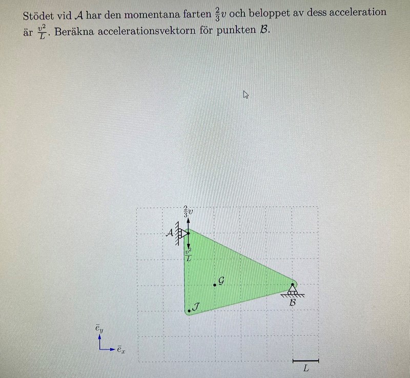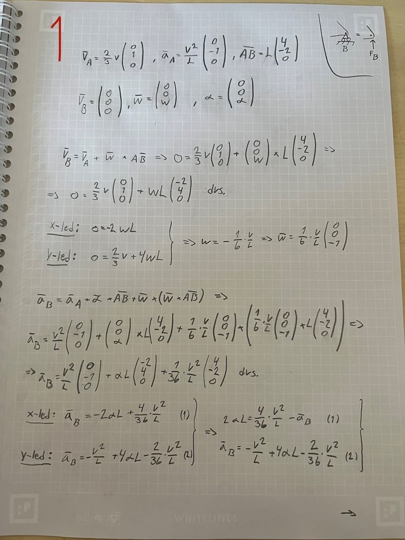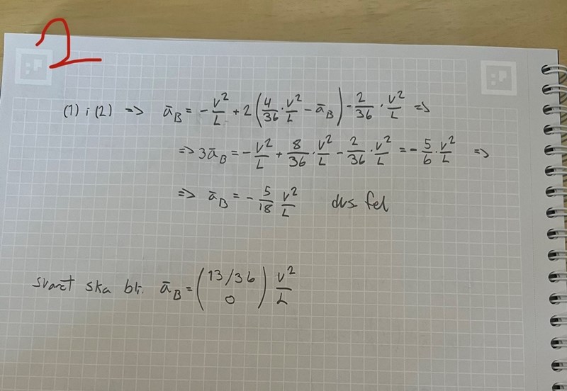 Får inte fram rätt svar och kan inte lista ut vad det är jag gör fel. Har även testat med vB=(0 ; 1 ; 0) i fall att om stödets "motkraft", dvs i positiv y-riktning, skulle spela någon roll men jag får ändå fel. Min lösning finns nedan. Vet någon hur man ska göra? Eller i alla fall leda mig i rätt riktning. Det korrekta svaret finns även på sista sidan.