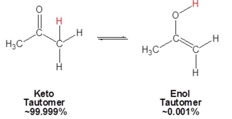 Sedan sker keto-enol tautomerisering (tror inte detta ingår i Ke2, utan mer universitetsnivå, men jag provar med en beskrivning). Under keto-enol tautomerisering kan ketogruppen (C=O till vänster i bilden nedan) omvandlas till en enol (till höger, genom att en proton "byter plats"). Men syret drar till sig elektronerna starkare, än något av kolen. Det gör att keto-formen dominerar och, som Micimacko var inne på, att bubbelbindningen i keto-gruppen inte blir fullt så polariserad mot syret - så även om det finns två fria elektronpar att vätebinda med är acetonen kemiskt sätt inte så sugen på detta. Men det går ju så klar teoretiskt.