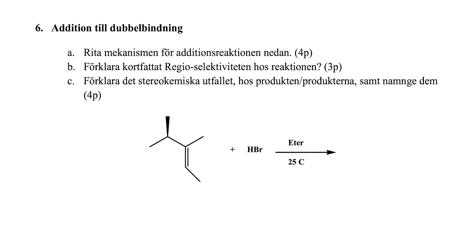 jo då jag har nog löst det. Bromet sätter sig på det mest substituerade kolet, markovnikovs regel, det är svaret på b. Sen c är ju att det kan peka inåt eller utåt vilket kan leda till s och r eller hur?