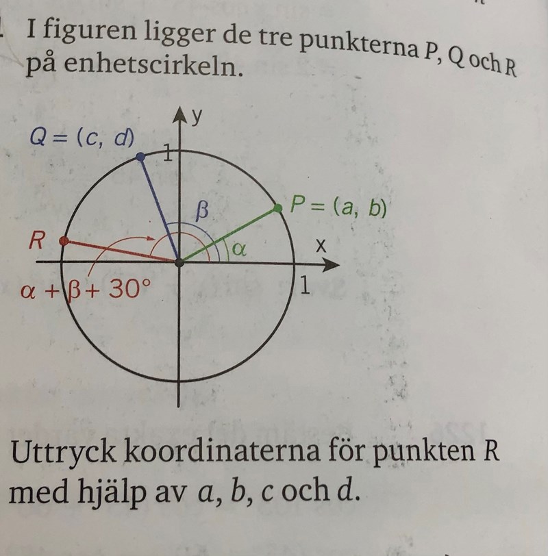 Nej men jag vet att x värde i punkten R är lika med cos(α + β + 30) och y värde är sin(α + β + 30)