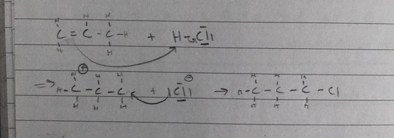 hej, här så ska propen ha reagerat med väteklorid. Jag skulle ange vilken sorts reaktion det är och eftersom propen är en alken så borde ju det vara en additionsreaktion! Men har jag gjort rätt? dubbelbindningen attackerar vätet och elektronen förskjuter sig mot Cl, sedan så har Cl fått ett överskott och en karbokatjon har bildats