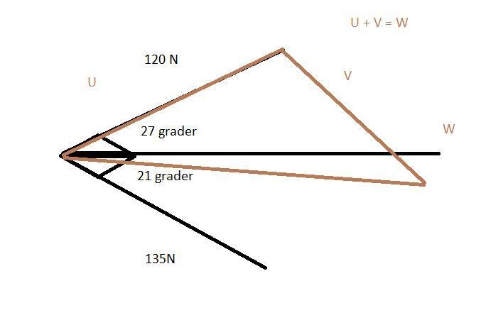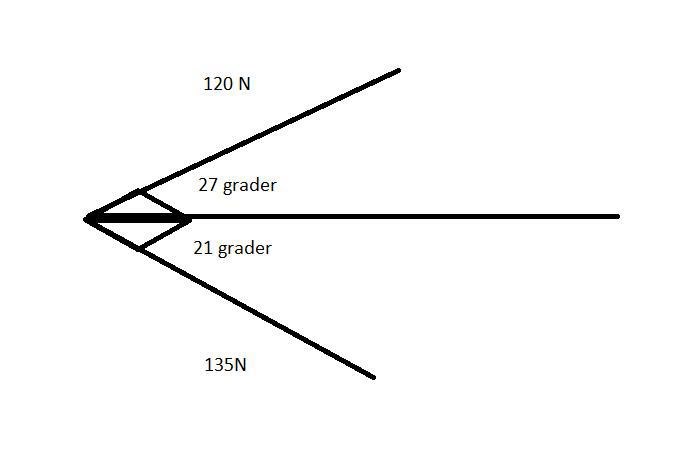 Vektorn snett upp åt höger, 120 N, går att dela upp i en vektor som pekar rakt upp, och en annan som pekar rakt åt höger. Den åt höger har beloppet 120cos(27) (och den rakt upp 120sin(27))