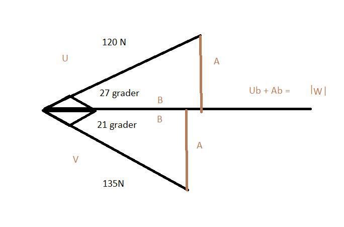 Så därför tänkte jag att jag kunde lösa uppgiften genom att använda mig av tangens på graderna för att få fram sambandet mellan a och b, så att jag sedan kan ta fram X och Y koordinater. (1/tan(27) ; 1) + (1/tan(21) ; (-1)) = W = (4.574 ; 0), vilket verkade stämma. Sedan tog jag bara 120/(1/tan(27)) för att få fram värdet av varje X koordinat (61.079). (Detta blir olika om man gör 120/(1/tan(27)) eller 135/(1/tan(21)) men jag utgick från att mina beräkningar skulle bli fel ändå eftersom sambandet mellan U och V inte är lika 135/21 =/= 120/27, men bara så ni förstår var jag kommer ifrån). Sedan blir jag inte förvånad när 4.574 * 61.079 = |W| blir fel, men skulle någon kunna förklara om boken har fel svar eller jag bara gjorde helt fel?