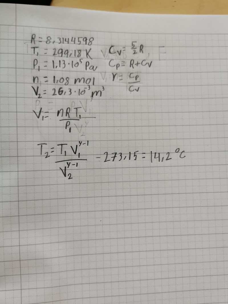 Jag antog korrekt att det var en adiabatisk process, så jag antog även att jag kunde beräkna temperaturen i läge 2 med hjälp av allmänna gaslagen () och poisson's lag (). Mitt svar blev 14,2 grader celsius men det korrekta svaret var 17,1 grader celsius.