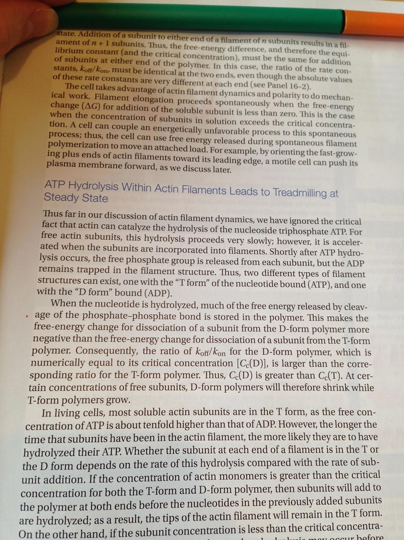 jag är med på att addition av en aktin mobiler på endera ände av filamentet ger att man har lika många monomereri filamentet oavsett hållet man adderar på.