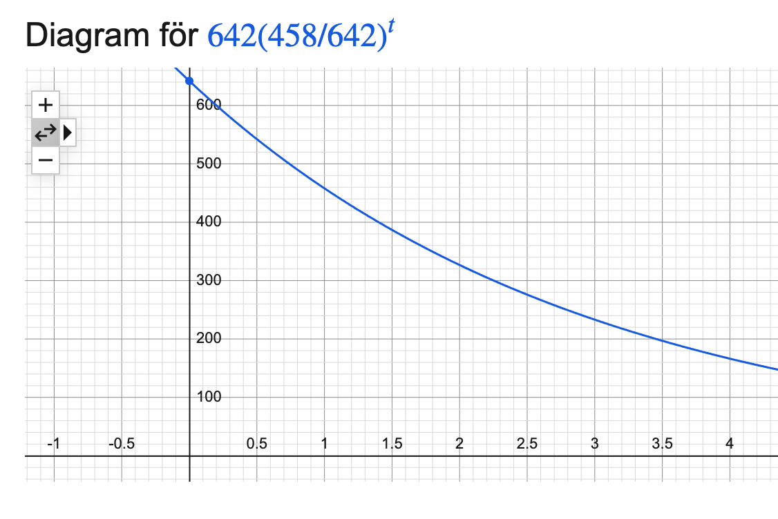 Så det blir strax innan halv två att aktiviteten är 200 Bq.