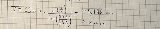 Om man avrundar halveringstiden T = 2 H så blir t= 3,86 H efter beräkning.