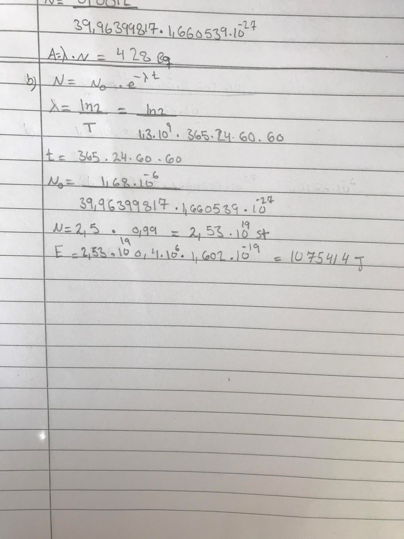 jag vet att jag tänker fel eftersom jag fick ett stort tal men jag ska i alla fall redovisa hur jag tänkte. Jag använde mig av sönderfallslagen eftersom jag vet tiden, landa och jag kan även räkna antal kärnor från början. Sedan efter att jag använde mig av lagen så fick jag hur många kärnor har jag efter ett år. Sedan multiplicerade jag antal kärnor med energin som är angivet i frågan.