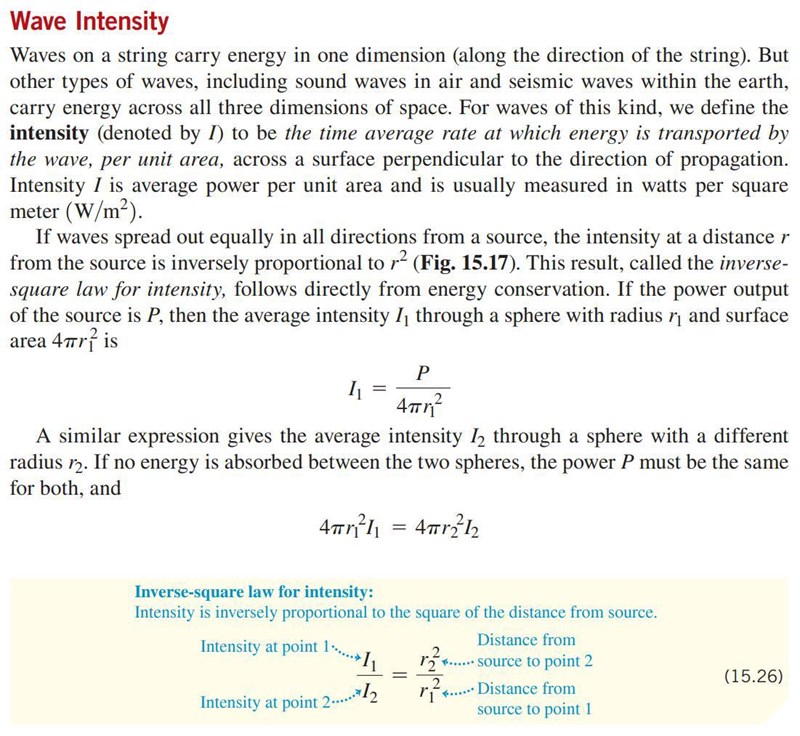Jag skulle ha använt bokens modell, men tänkt ljudet spridas i en halvsfär (det brukar vara stor skillnad på ljudet framför respektive bakom en högtalare). Men oavsett om man tänker sig en halvsfär eller en helsfär så så blir ju intensiteten avtagande med kvadraten på avståndet.