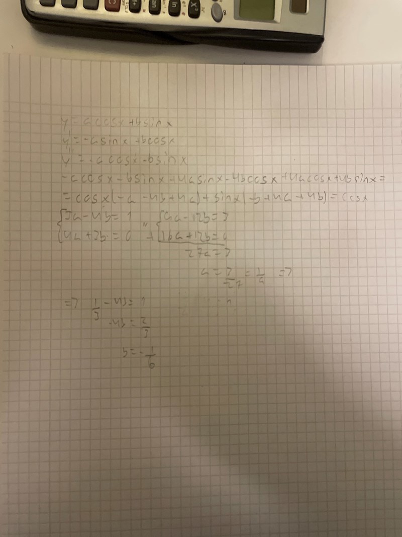 Uppg 4129. När jag sätter in första derivatan ska det vara -4 som faktor. Faktor för sinx bör vara positiv och cosx negativ. Detta har jag gjort, men ändå blir det fel.. Hur? (Jag håller på o bli tokig)