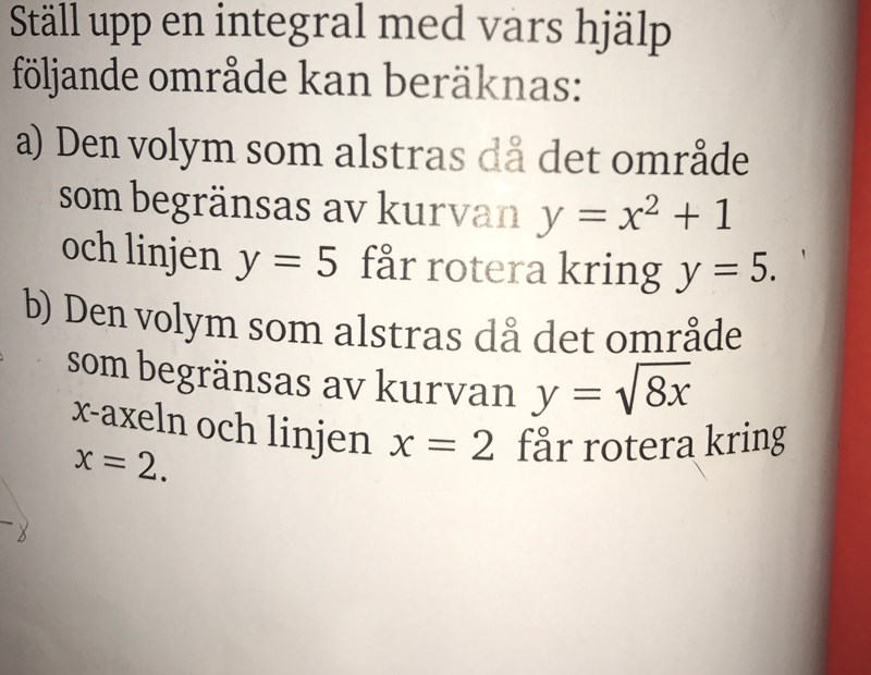 Gabriella S skrev :Om det blir volym med ihålighet hur hade det varit? Menar vad hade stått i uppgiften så att man ser de.. den roterar ju inte kring y axeln utan kring x= 2....
