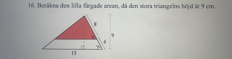 Ett annat sätt är att först beräkna den stora triangelns area och sedan använda att areaskalan = (längdskalan)2