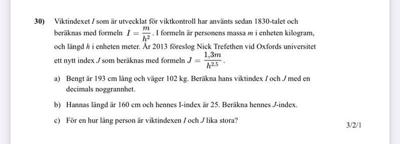 Hej! Jag behöver hjälp med fråga c) på den här uppgiften inför mitt halvkursprov imorgon. Ställde upp ekvationen m/h2 = 1.3m/h2.5 men kommer inte vidare därifrån. Har frågat flera vänner men ingen av oss lyckas lösa. :))