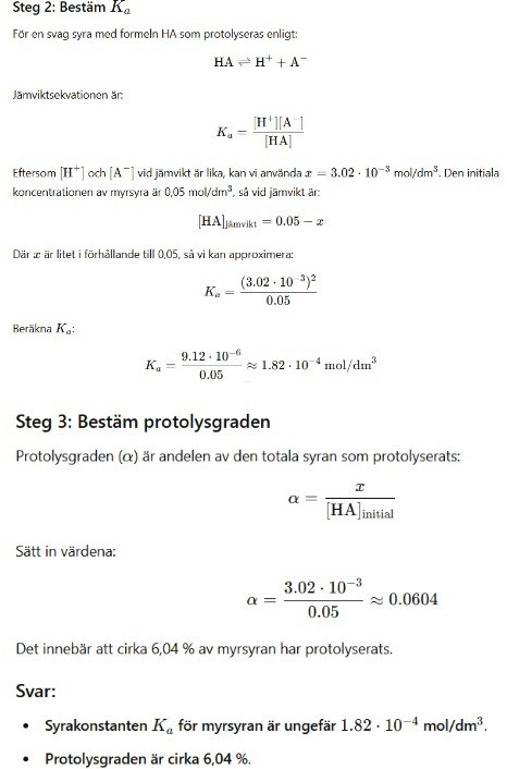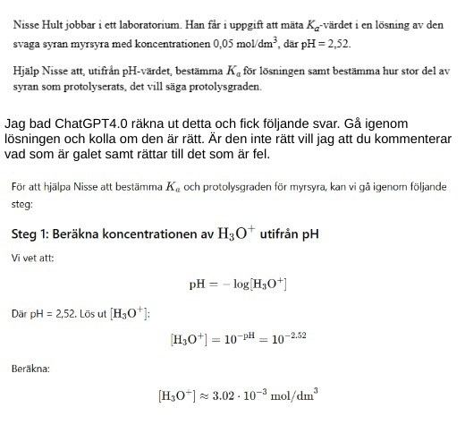 Fundera över antagandet att "x är litet i förhållande till 0,05". Stämmer det? Vad är x i detta fall? Vad får du för värde på Ka om du inte gör detta antagande? Skiljer det sig från svaret som angavs av chatGPT?