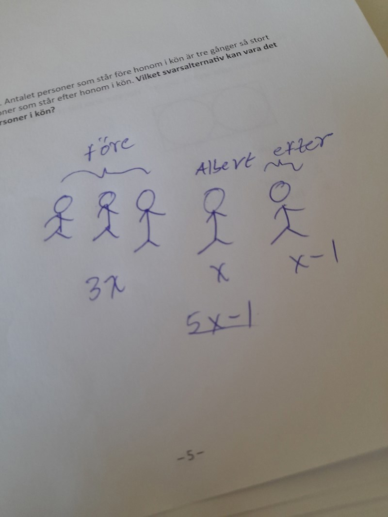 Antag att det står x personer efter Albert. Hur många personer står före honom? Hur många personer är det sammanlagt i kön?