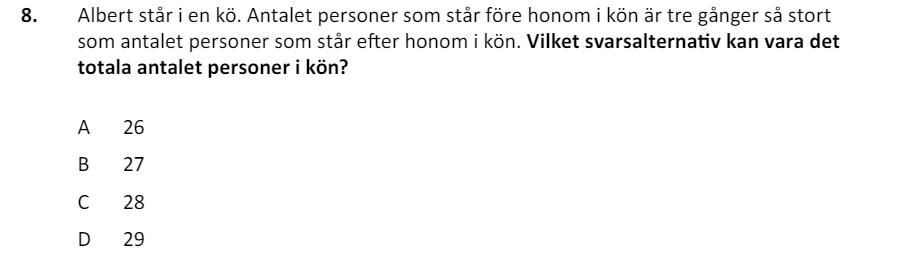 Antag att det står 3 personer efter Albert. Hur många personer står före honom? Hur många personer är det sammanlagt i kön?