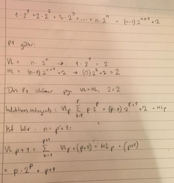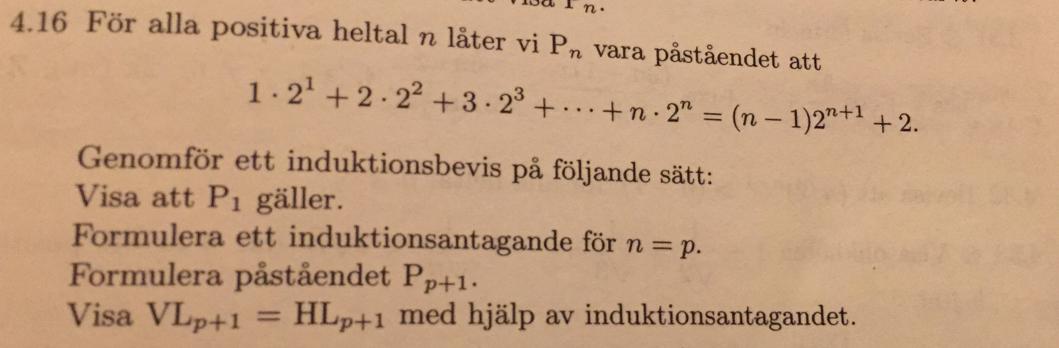 Uppgiften är ju ett induktionsbevis, så den diskussionen måste naturligtvis fortsätta. Men om jag tänker lite off-line här, så luktar det derivata av geometrisk summa. Låt S(n) vara den angivna summ.an. Addera den geometriska summan T(n)= 2 + 22 + 23 +...2n . Då är S(n)+T(n) = 2*2+3*22 +4*23 ...(n+1)2n som är derivatan av x2 +x3 +...xn+1 i punkten x=2. Den sistnämnda summan är geometrisk och har därför känd summa. Deriverar vi denna så borde S(n) erhållas utan induktionsbevis.
