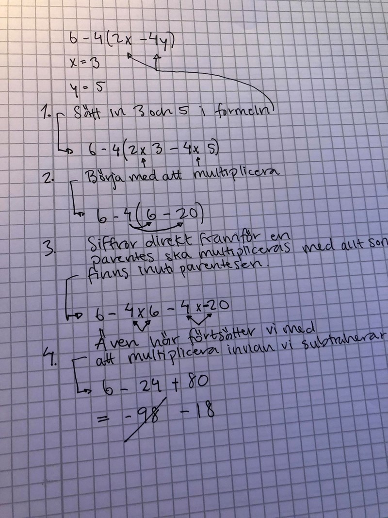 Helt rätt! Det glömde jag. Det gör att -4 x -20 blir 80, alltså positivt. Då ändras svaret till -18 istället.