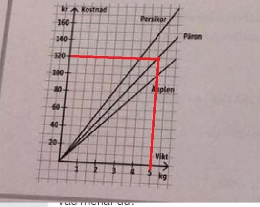 Vi håller bå med b just nu som handlar om päronpriset. Läs av igen och försök göra det noggrannare. Jag får det inte till att 5 kg kostar 140 kronor. Hål koll på rutorna och följ linjen upp noggrant.