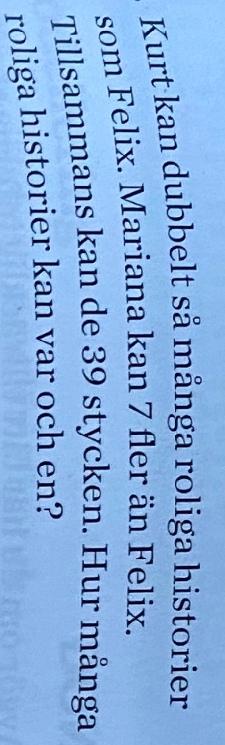 Du bestämmer vad du vill kalla x. Eftersom både Kurt och Mariana jämförs med Felix blir det enklast att säga att Felix kan x stycken historier.