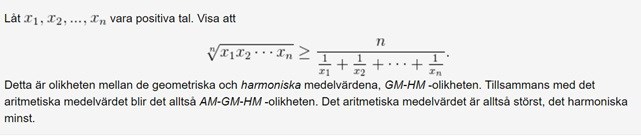 jag gissar att ni redan gått igenom olikheten mellan aritmetiskt och geometriskt medelvärde. Olikheten mellan geometriskt och harmoniskt medelvärde kan bevisas från den.