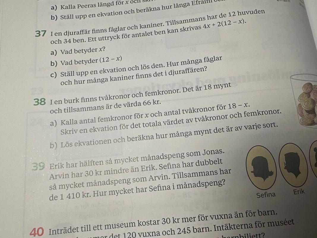 38) jag skrev ekvationen 2x-18= 66 fick att X var 42 och x-18 var 24 alltså är de värde tsm 66 kr 18 st men hur ska ja veta 44 kr hur många mynt de är
