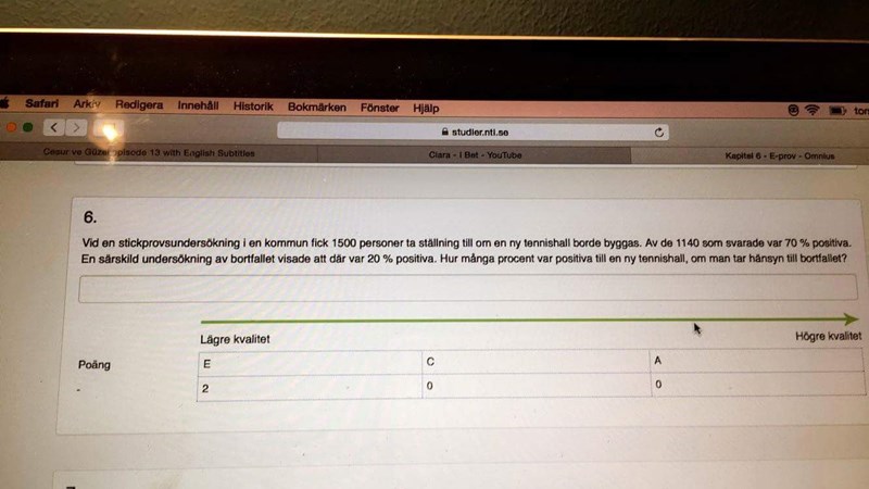 2. Vi vet att bortfallet motsvarar 1500-1140=360 personer.