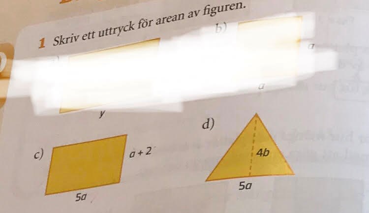 Om vi tar uppgift (c) så ska vi skriva ett uttryck för den givna rektangeln och dess mått på längd respektive bredd. Vi behöver veta hur man räknar ut arean av en rektangel. Arean för en rektangel är (längden * bredden) —> (lb). I och med att du har ett givet värde för längd och bredd tar du och multiplicerar (längden * bredden) för de givna måtten. Vi får: 5a(a+2) = 5a^2 + 10a = arean av rektangeln. Samma sak gör du för triangeln. Arean av en triangel är (basen*höjden)/2. Kan du ta dina givna mått och beräkna dem enligt formeln för att få fram ett uttryck för arean? 🌺