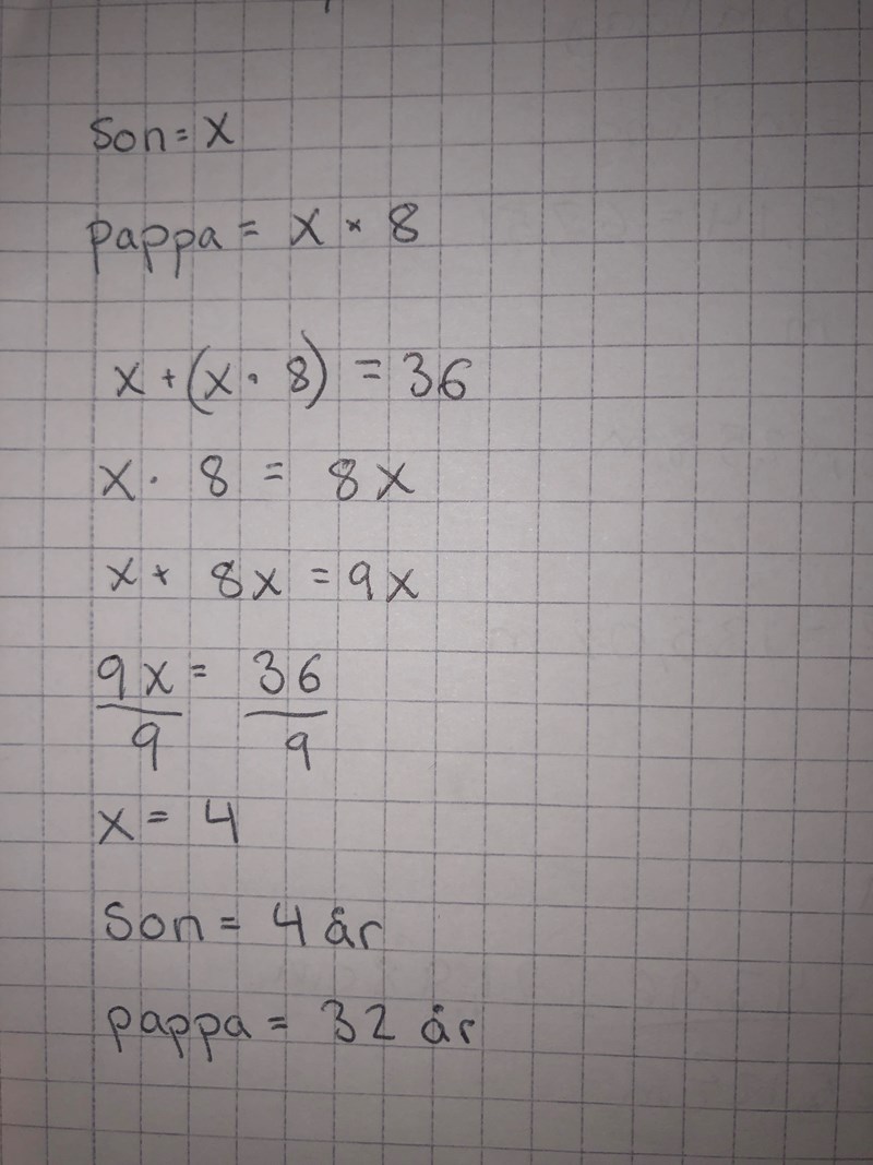 Det ser bra ut! Du kan alltid testa din lösning genom att sätta in de svar du får. Om sonen är fyra år och pappan är 32, är pappan då åtta gånger äldre än sonen? Ja. Är summan av åldrarna 36? Ja. Bra! :)