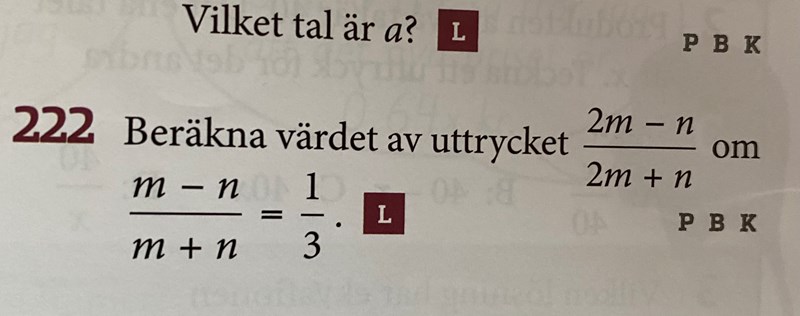 (m-n)/m+n=1/3 leder till 3(m-n)=m+n lös olikheten blir m=2n. Sätt in detta i andra ekvationen