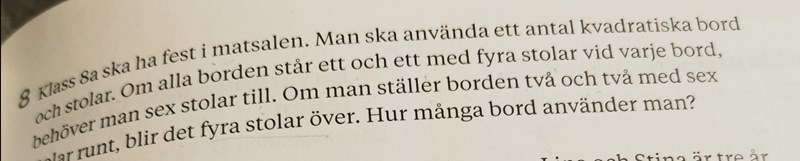 Klass 8a ska ha fest i matsalen. Man ska använda ett antal kvadratiska bord och stolar. Om alla borden står ett och ett med fyra stolar vid varje bord, behöver man sex stolar till. Om man ställer borden två och två med sex stolar runt, blir det fyra stolar över. Hur många bord använder man?
