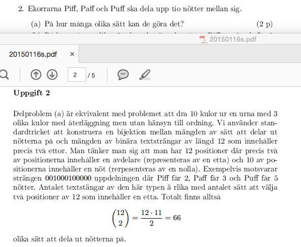 Varje kombination av 12 tecken med 2 avdelare (1:or) och resten nötter (0:or) motsvar en uppdelning av nötterna mellan de tre ekorrarna.