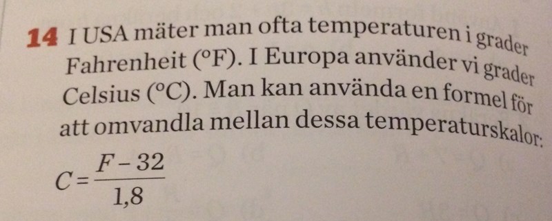 Dvs lös ut FF ur ekvationen 0=F-321.80=\frac{F-32}{1.8}