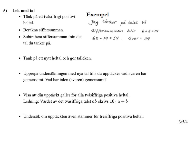 Okej, jag förstår nu. Men sedan när jag ska prova samma sak med 3-siffrigt tal så får jag samma upptäckt: alla talen är delbara med nio, precis som innan. Men, jag har inte fått någon formel i uppgiften, därav får jag full pott på den frågan genom att visa att upptäckten stämmer med ett flertal exempel? Eller vad ska göras för att kunna uppnå full poäng på den sista delfrågan?