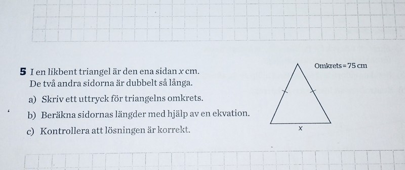 Du har en sida x, och två sidor som vardera är dubbelt så långa, alltså 2x. Vad blir det om du lägger ihop sidorna?