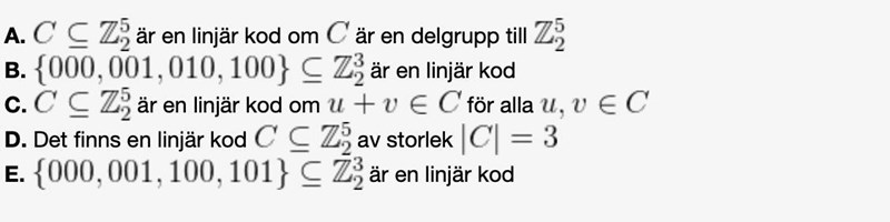 Frågan är vilka av följande påståenden om linjära koder stämmer? Jag tror att D och E men det känns som att jag totalt fel vad gäller D och E men också andra alternativ som finns.