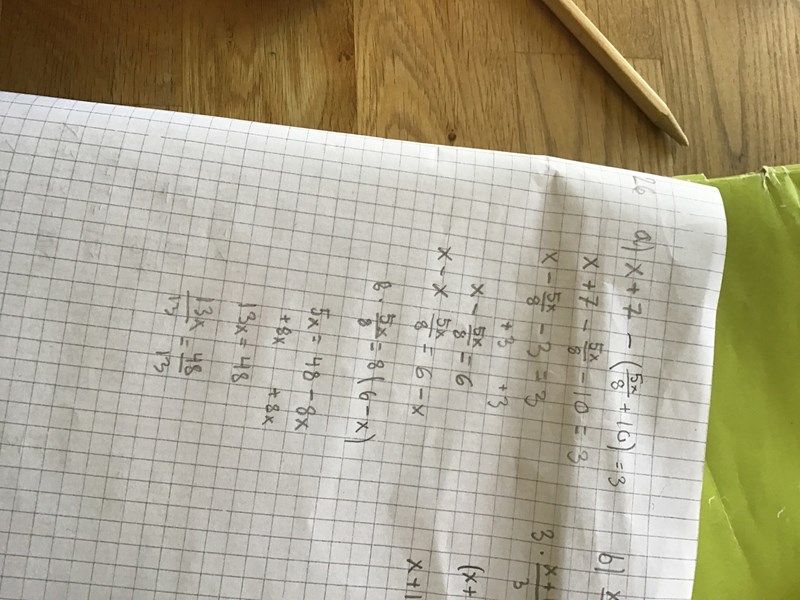 jag bröt upp parentesen och försökte ta bort tal för att få x för sig självt. 5x/8 multiplicerat med 8 och på höger ledet också. (+8x) Då fick jag 13x=48. Vilket inte stämmer