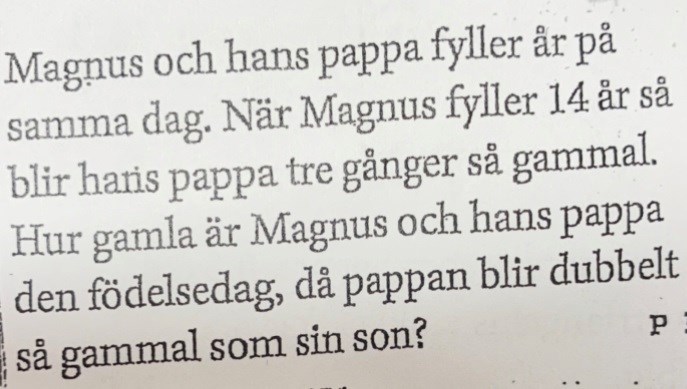 Och då kan du ställa upp en enkel ekvation eftersom pappans ålder x+28 år är dubbelt så hög som Magnus x år.