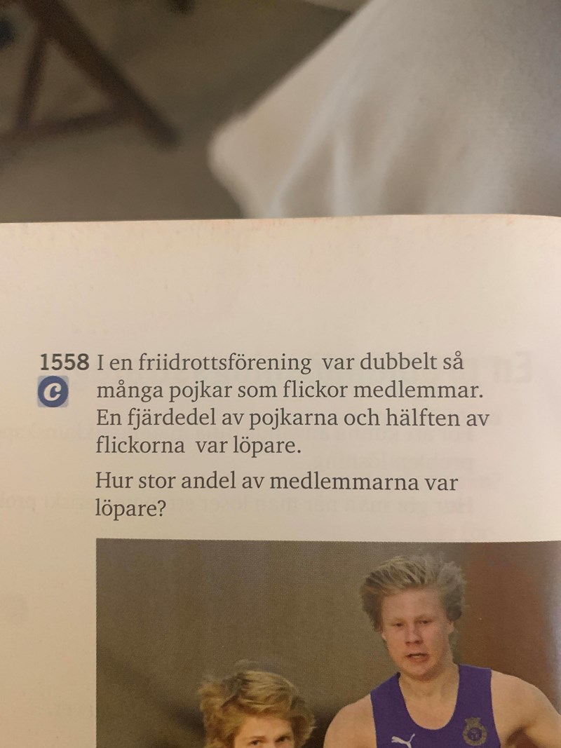 Det var en slarvig formulering av mig, jag har rättat till den nu. Tanken är att du ska beräkna andelen löpare i föreningen. x/4+(x/2)/2 (du har skrivit 2/x istället för x/2) ger dig ett uttryck för antalet löpare i föreningen. Det totala antalet medlemmar i föreningen ges av summan av pojkarna och flickorna, vilket är x + x/2 = 3x/2. :) Hur stor är andelen löpare? :)