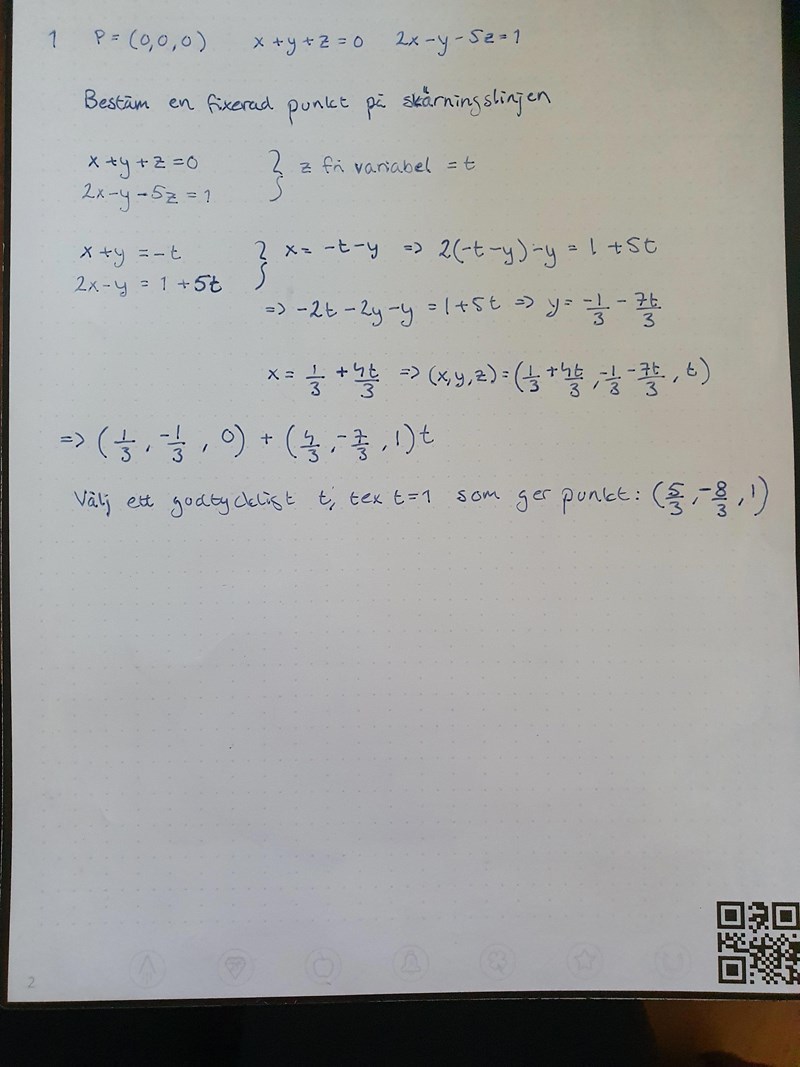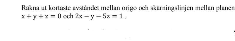 Givet är två plan i en 3dimitionell koordinatsystem och uppgiften är att ange det kortaste avstånded från origo till skärningslinjen. Har börjat med att ta fram skärningslinjen men vet inte hur jag ska fortsätta efter det.