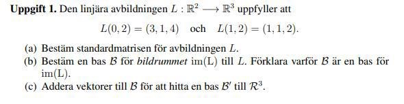 Uppgift a) och b) är klara. Min fråga är gällande fråga c). Jag förstår inte riktigt vad de vill, ska jag bara lägga till en vektor som är linjärt oberoende till de andra vektorerna i ?