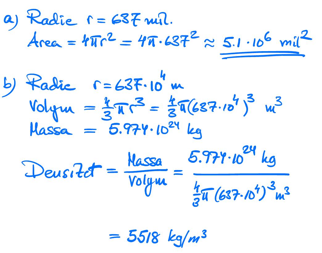 och för att rärkna b) så tog jag först vikten delat på arean, men det är ju förstås fel, eftersom man ska dividera det med volymen och inte arean, så jag tog reda på volymen, och fick 1082148050000 m³